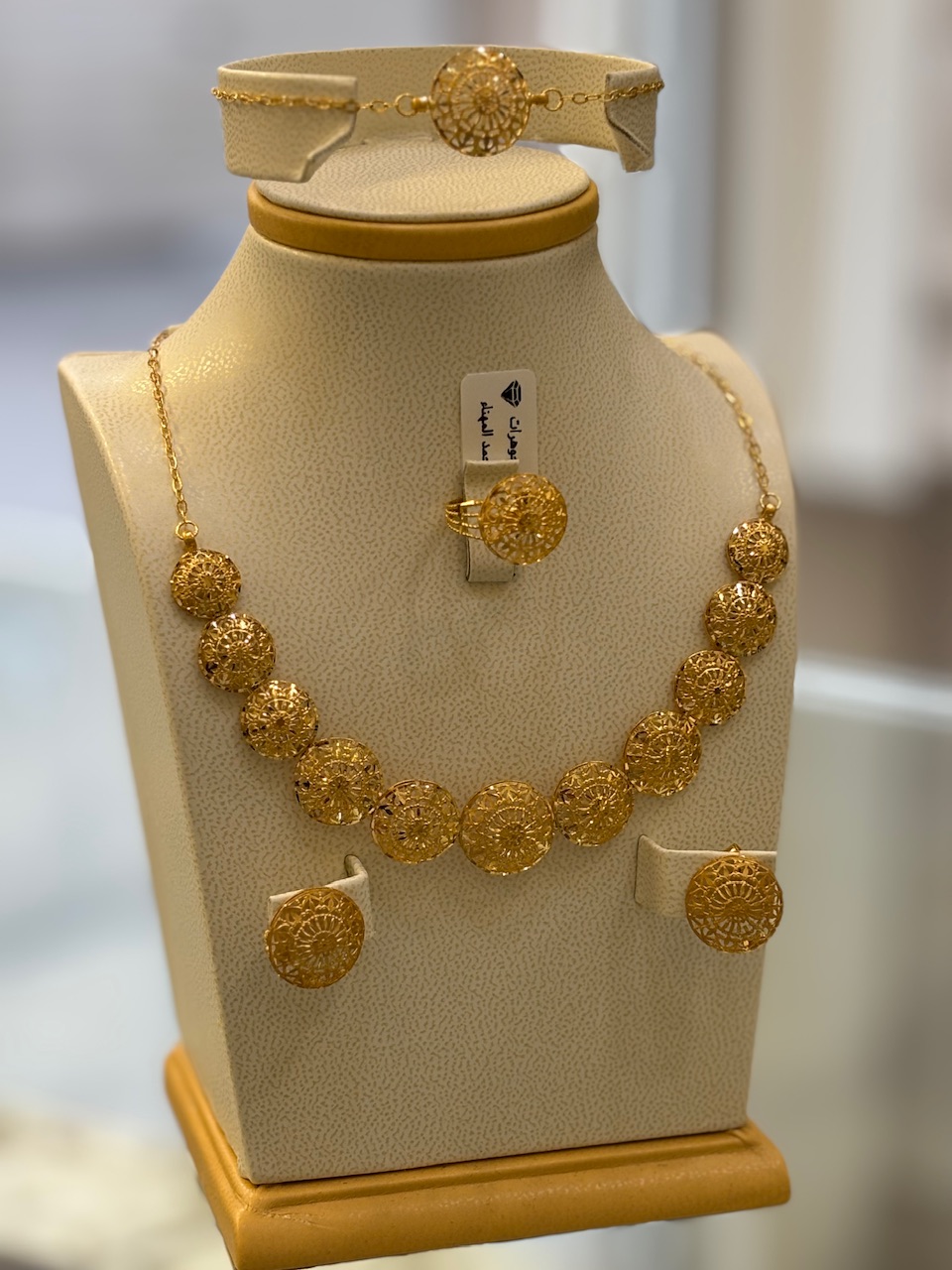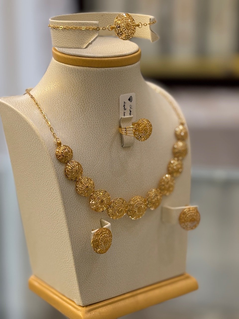 طقم كامل شبكة ذهب صافي عيار 21 يتكون من عقد وحلق وخاتم واسوارة