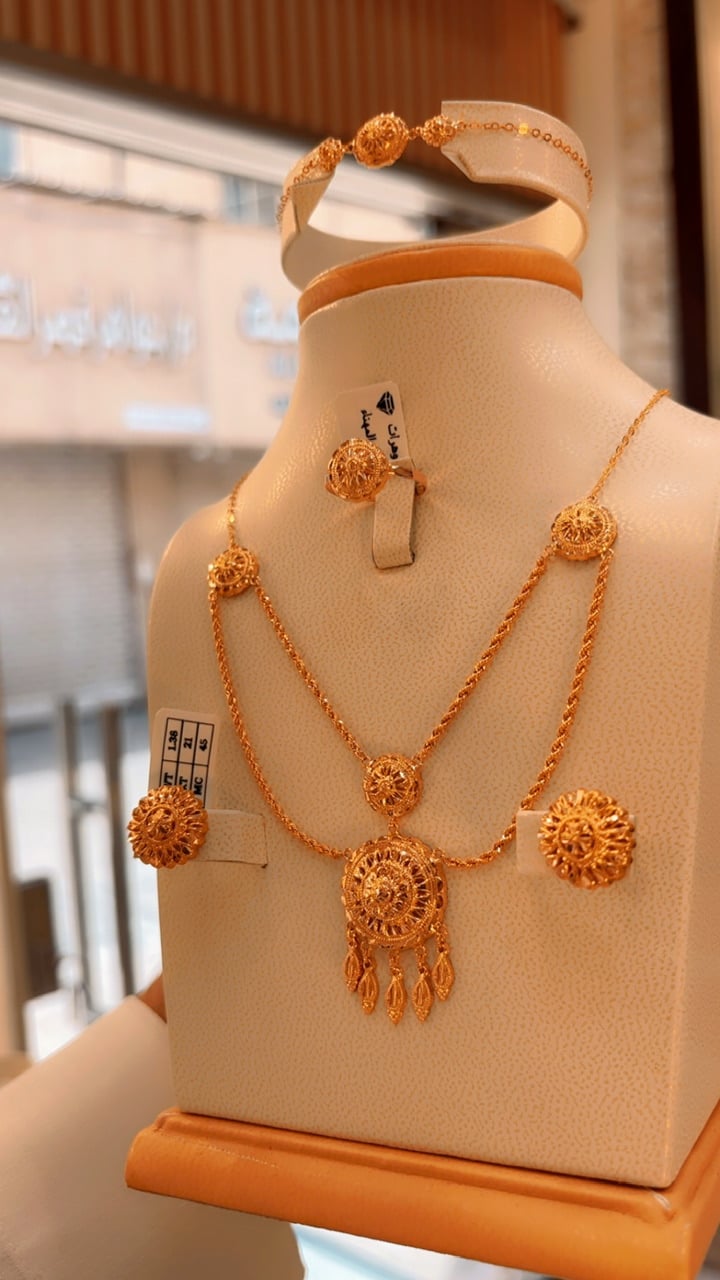 طقم كامل تصميم وردات كرسي جابر مكون من عقد دورين واسوارة وخاتم وحلق ذهب صافي عيار 21